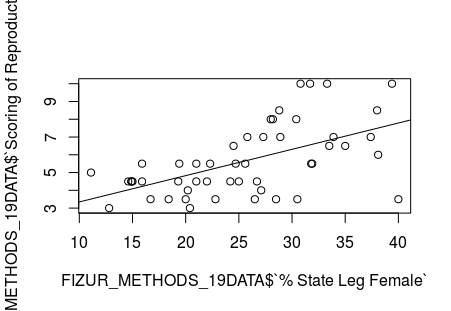 Therefore, how has this increase in women representatives in state legislature affected reproductive rights policies in a given state? My hypothesis was that the more women in a State legislature led to that State having more reproductive rights legislation. Quantitative research was collected and observed including the percentage of women representation in each state legislature which was collected from the Center for Women in American Politics (CWAP) in 2018 as well as other figures from the National Conference of State Legislatures (NCSL) and the Guttmacher Institute. I further developed a scoring system wherein each state received a score from 0-10 regarding the amount of reproductive rights in each state with 0 representing no reproductive rights and 10 representing the most reproductive rights. Factors that were considered to reach each score include: abortion legislation that was passed; if exceptions for health concerns or rape/incest were provided; if state funding was provided for abortions; if legislation existed that required private health insurance to cover such procedures; as well as if waiting periods, counseling and parental notification/consent regarding a minor was required prior to the procedure.